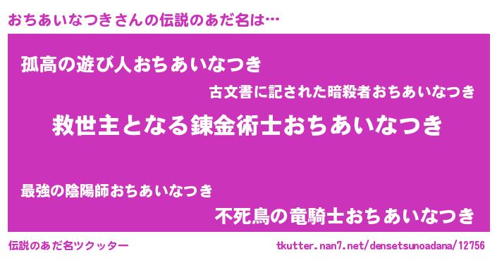 | 男性向けラノベタイトル風あだ名 | 『おちあいなつき~年齢イコール彼女いない歴の魔法使い~』 |