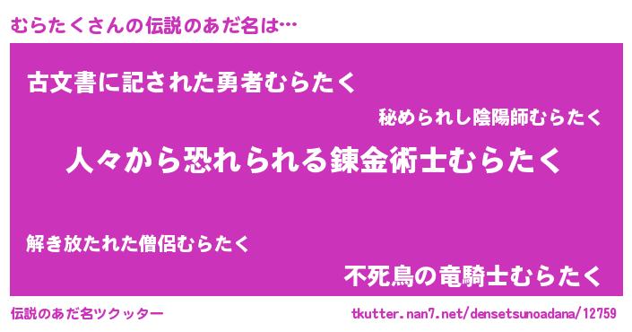 | 意味不明あだ名 | 『自称むらたく』『永久保存むらたく』 |