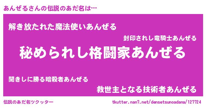 | 女子向けラノベタイトル風あだ名 | 『あんぜるの雑貨屋さん』『闇のあんぜる』 |