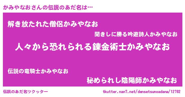 | 女子向けラノベタイトル風あだ名 | 『かみやなおが死なない童話 林檎のかみやなおの診療簿』 |