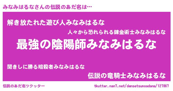 | ポケモン風あだ名 | 『ミナミダネ』『ヒミナミハルナ』 |