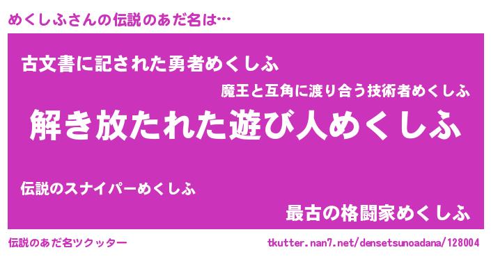 | 女子向けラノベタイトル風あだ名 | 『めくしふの卵を拾いまして』 |