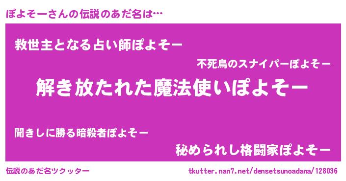 | ヒーロー風カッコイイあだ名 | 『銀牙騎士ポヨ』『天空の使者ぽよそー』 |