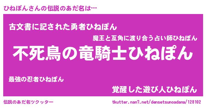 | 女子向けラノベタイトル風あだ名 | 『ひねぽん姫と円卓の騎士』 |