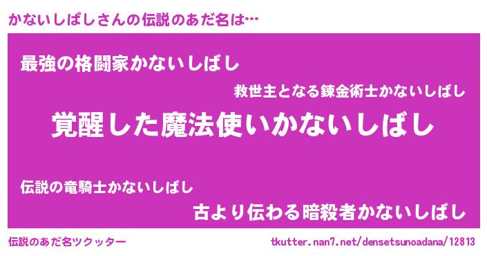 | 男性向けラノベタイトル風あだ名 | 『かないしばしの嫁は女の子じゃないと思った?』 |
