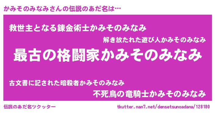 | 意味不明あだ名 | 『住所不定無職かみそのみなみ(1歳)』 |