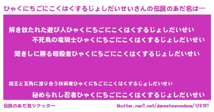 | 女子向けラノベタイトル風あだ名 | 『異世界で失敗しない100のひゃくにちごにこくはくするじょしだいせい』 |
