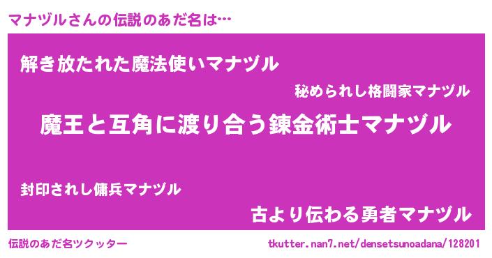 | 男性向けラノベタイトル風あだ名 | 『ノーゲーム・ノーマナヅル』 |