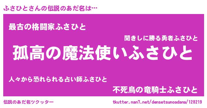 | ヒーロー風カッコイイあだ名 | 『黄金騎士フサ』『ウルトラふさひとマン』 |