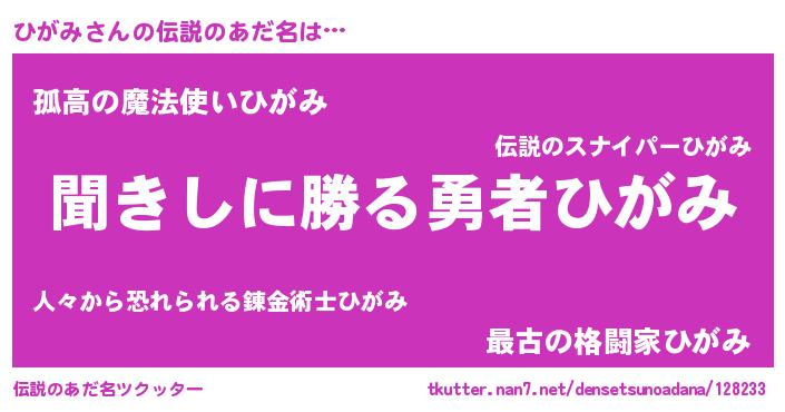 | 意味不明あだ名 | 『自称ひがみ』『永久保存ひがみ』 |
