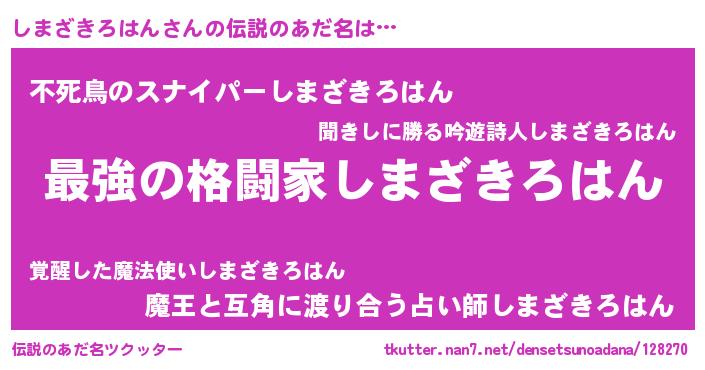 | 男性向けラノベタイトル風あだ名 | 『しまざきろはん~年齢イコール彼女いない歴の魔法使い~』 |