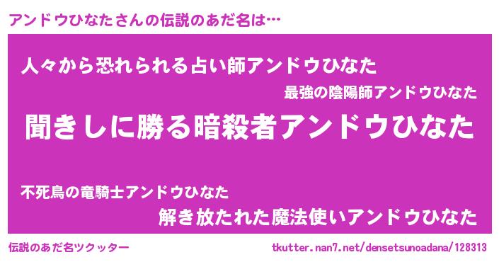 | 女子向けラノベタイトル風あだ名 | 『異世界で失敗しない100のアンドウひなた』 |