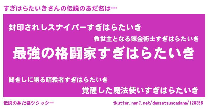 | 意味不明あだ名 | 『自称すぎはらたいき』 |