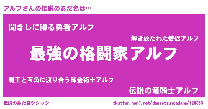 | ヒーロー風カッコイイあだ名 | 『最強戦士アルフ』『ウルトラアルフマン』 |