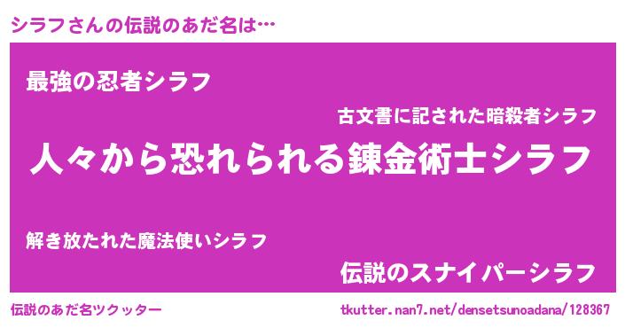 | ヒーロー風カッコイイあだ名 | 『正義の使者シラフ』『究極戦士シラフ』 |