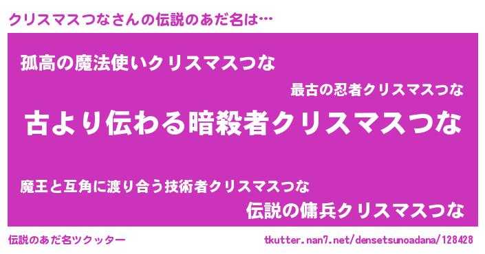 | 男性向けラノベタイトル風あだ名 | 『クリスマスつなという概念が存在しない退屈な世界 』 |