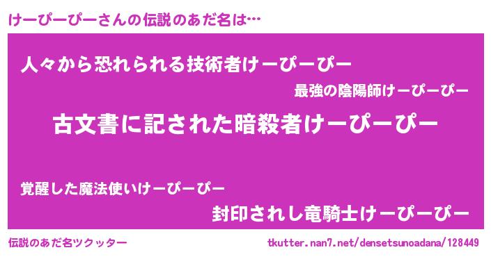 | 男性向けラノベタイトル風あだ名 | 『うちのけーぴーぴーが世界を掌握している!』 |