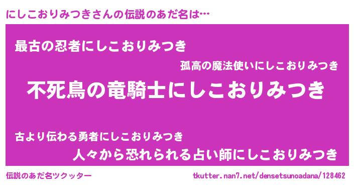 | 男性向けラノベタイトル風あだ名 | 『ニシコオリミツキアートオンライン』 |