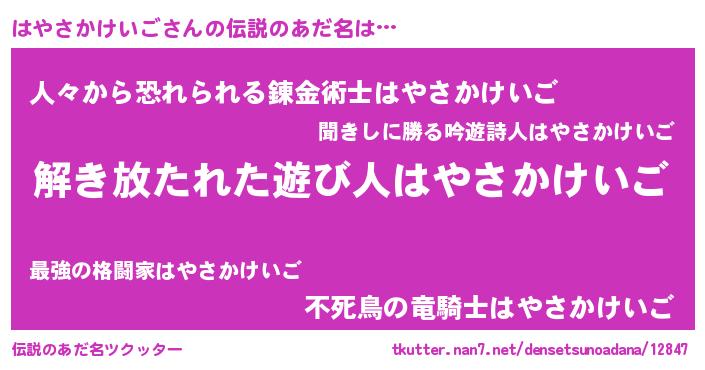 | 男性向けラノベタイトル風あだ名 | 『はやさかけいごの嫁は女の子じゃないと思った?』 |