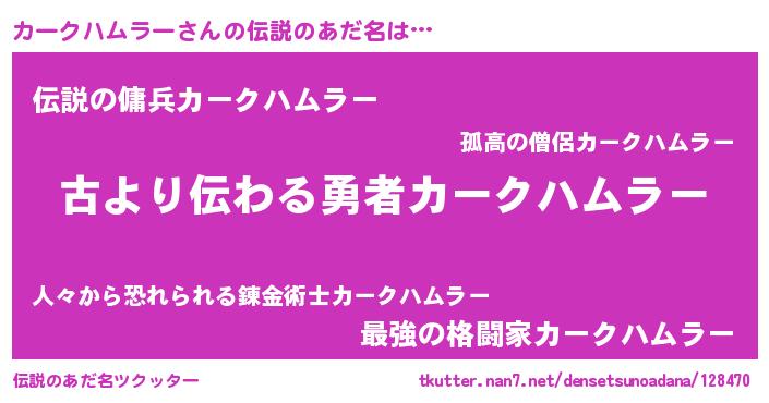 | 男性向けラノベタイトル風あだ名 | 『転生したらカークハムラーだった件』 |
