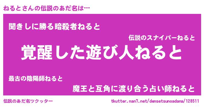 | 男性向けラノベタイトル風あだ名 | 『ねると~年齢イコール彼女いない歴の魔法使い~』 |