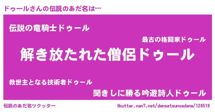 | 男性向けラノベタイトル風あだ名 | 『ドゥールの嫁は女の子じゃないと思った?』 |