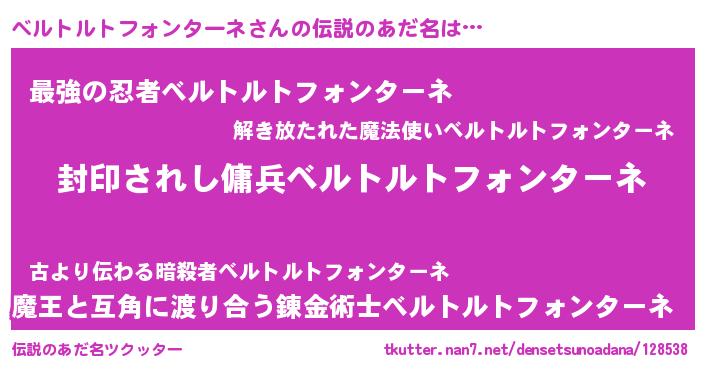| 男性向けラノベタイトル風あだ名 | 『ベルトルトフォンターネアートオンライン』 |