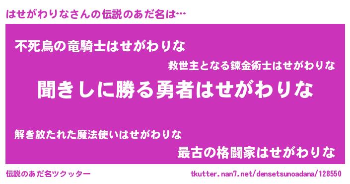 | 女子向けラノベタイトル風あだ名 | 『異世界で失敗しない100のはせがわりな』 |
