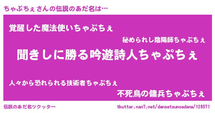 | 女子向けラノベタイトル風あだ名 | 『異世界で失敗しない100のちゃぷちぇ』 |