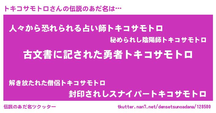 | 意味不明あだ名 | 『永久保存トキコサモトロ』 |