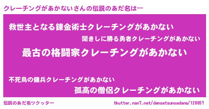 | 意味不明あだ名 | 『住所不定無職クレーチングがあかない(3歳)』 |