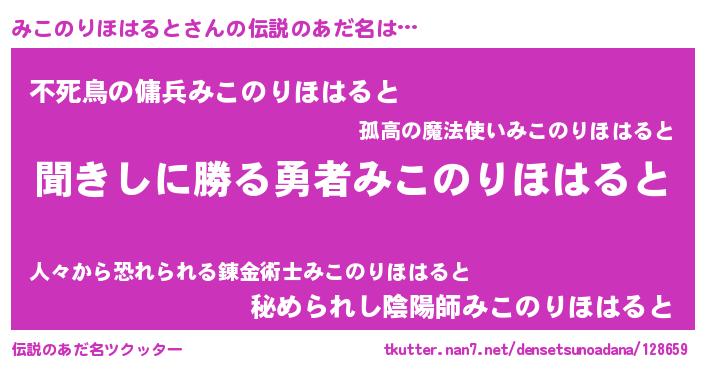 | 女子向けラノベタイトル風あだ名 | 『異世界で失敗しない100のみこのりほはると』 |