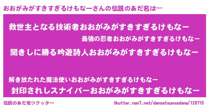 | 意味不明あだ名 | 『永久保存おおがみがすきすぎるけもなー』 |