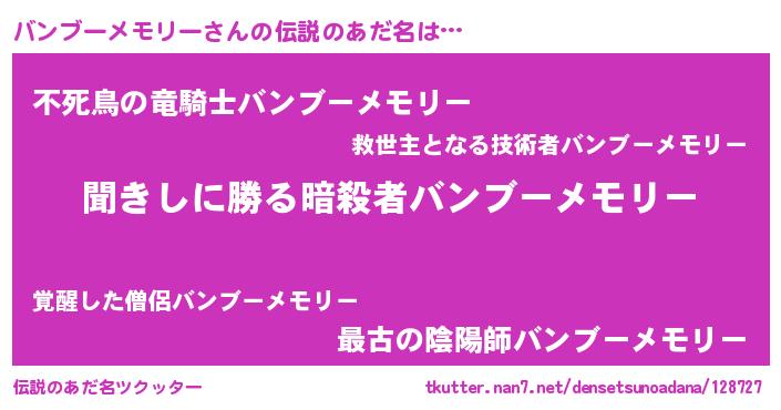 | 男性向けラノベタイトル風あだ名 | 『魔弾の王とバンブーメモリー』 |
