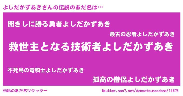 | 男性向けラノベタイトル風あだ名 | 『よしだかずあきに滅ぼされるだけの簡単なお仕事です』 |
