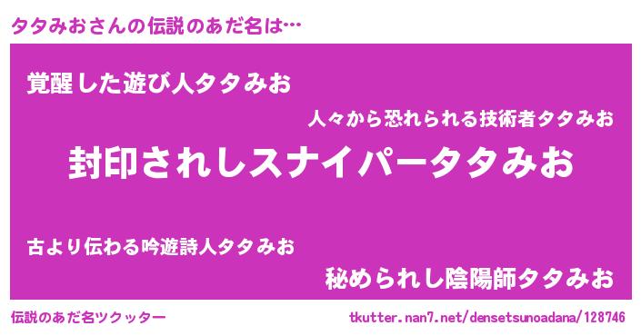 | 男性向けラノベタイトル風あだ名 | 『Re:タタみおから始める異世界生活』 |