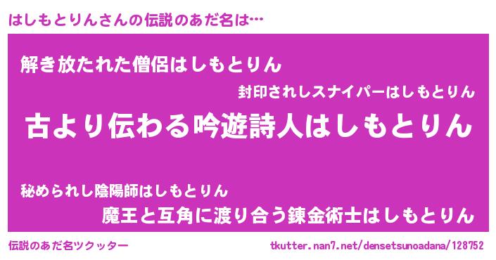 | 男性向けラノベタイトル風あだ名 | 『転生したらはしもとりんだった件』 |