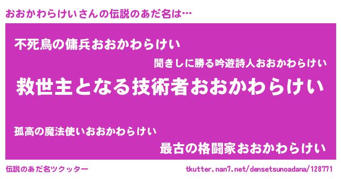 | 意味不明あだ名 | 『自称おおかわらけい』 |