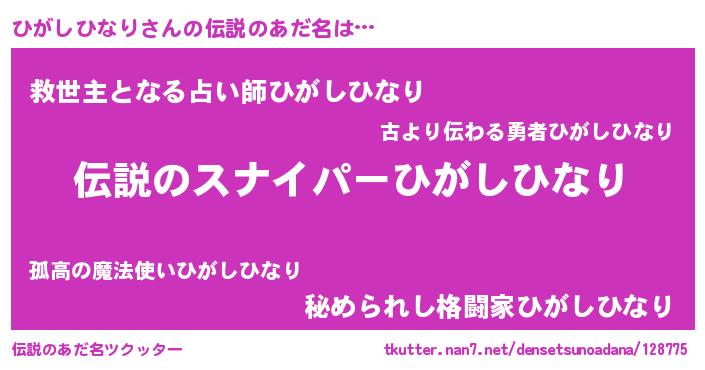 | ヒーロー風カッコイイあだ名 | 『仮面ヒガダー』『最強戦士ヒガシヒナリ』 |