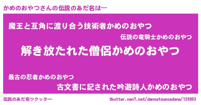 | 意味不明あだ名 | 『とにかく怪しいかめのおやつ』 |
