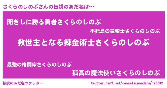 | 男性向けラノベタイトル風あだ名 | 『この素晴らしい世界にさくらのしのぶを!』 |