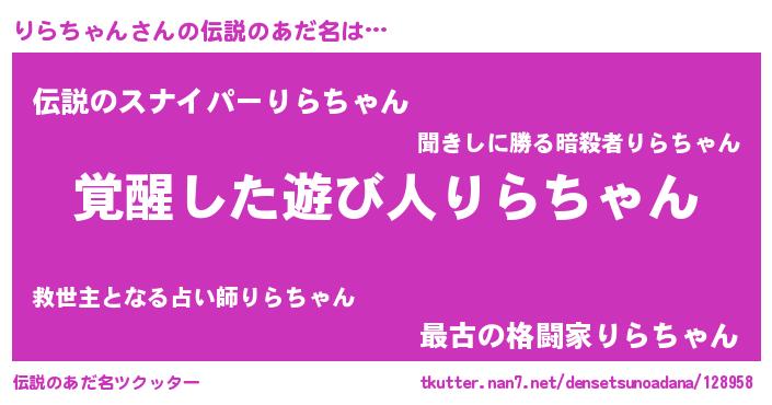 | ヘコむあだ名 | 『りらぷりん』『りらもー』 |