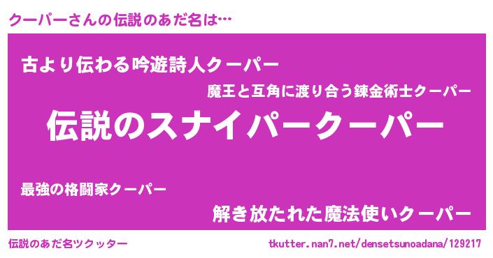 | 男性向けラノベタイトル風あだ名 | 『クーパーの憂鬱』『魔弾の王とクーパー』 |