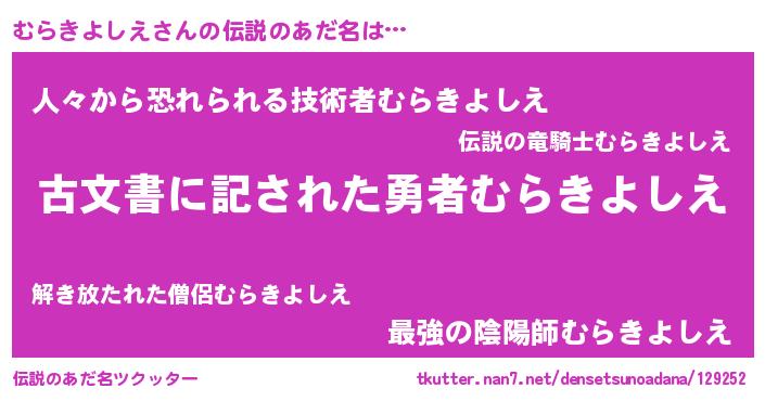 | 肩書あだ名 | 『むらきよしえ大将』『むらきよしえ先生』 |