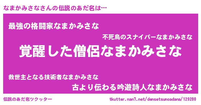 | 男性向けラノベタイトル風あだ名 | 『なまかみさなの嫁は女の子じゃないと思った?』 |