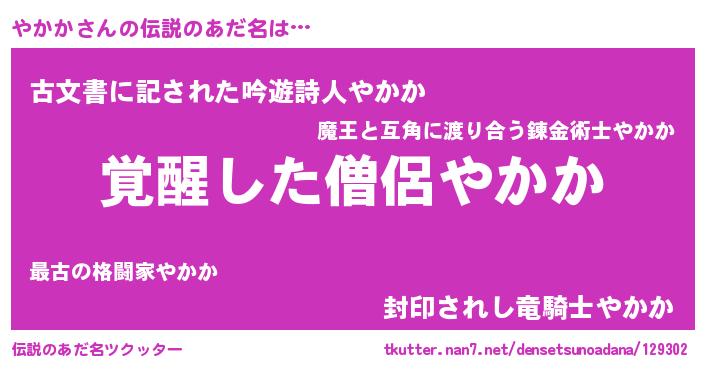 | 男性向けラノベタイトル風あだ名 | 『やかかに滅ぼされるだけの簡単なお仕事です』 |