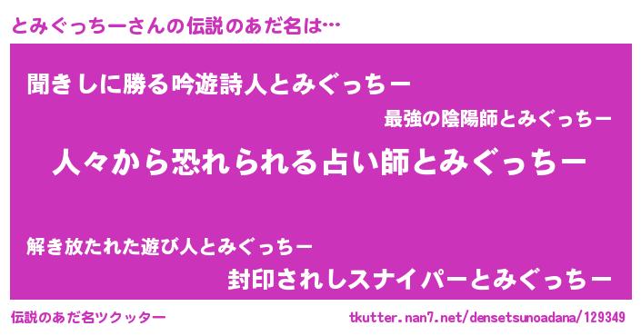 | 男性向けラノベタイトル風あだ名 | 『おまえをオタクにしてやるから、俺をとみぐっちーにしてくれ! 』 |