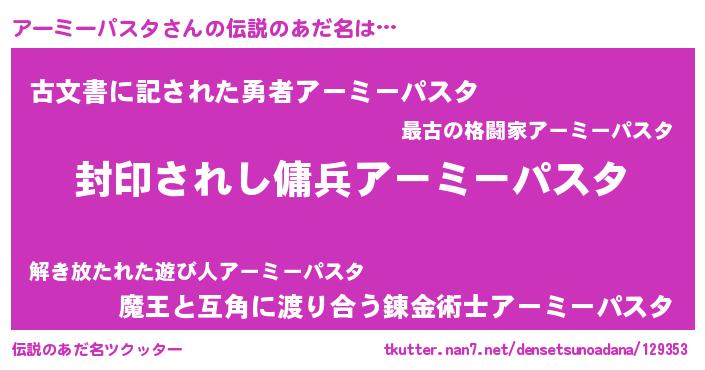 | ヘコむあだ名 | 『アーにゅー』『アーミーパスタ(震え声)』 |
