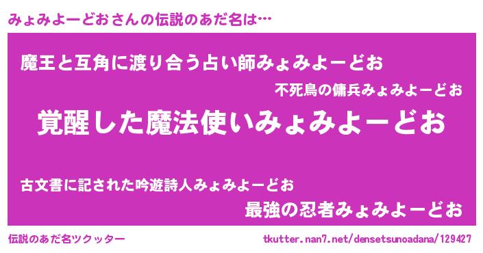 | 男性向けラノベタイトル風あだ名 | 『みょみよーどおの嫁は女の子じゃないと思った?』 |