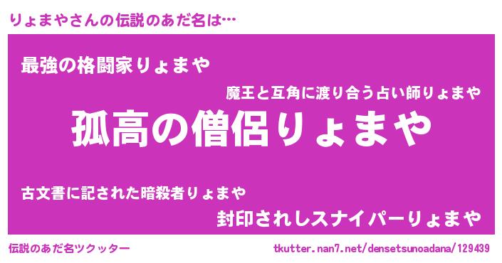 | ヒーロー風カッコイイあだ名 | 『魔戒騎士リョ』『ウルトラりょまやマン』 |